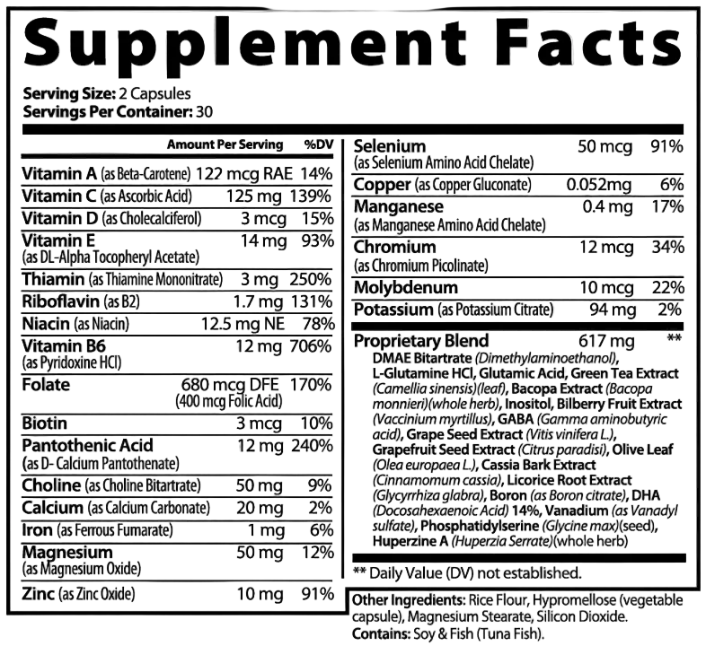 Ingredients: Vitamin A (as Beta-Carotene), Vitamin C (as Ascorbic Acid), Calcium (as Calcium Carbonate), Iron (as Ferrous Fumarate), Vitamin D (as Cholecalciferol), Vitamin E (as DL-Alpha-Tocopheryl-acetate), Vitamin B1 (as Thiamine Mononitrate), Vitamin B2 (as Riboflavin), Vitamin B3 (as Niacin), Vitamin B6 (as Pyridoxine HCL), Folate, Biotin, Vitamin B5 (as D-Calcium Pantothenate), Magnesium (as Magnesium Oxide), Zinc (as Zinc Oxide), Selenium (Selenium Amino Acid Chelate), Copper (as Copper Gluconate), Manganese (as Manganese Amino Acid Chelate), Chromium (as Chromium Picolinate), Molybdenum, Potassium (as Potassium Citrate), Choline (as Choline Bitartrate), Proprietary Blend (DMAE Bitartrate, L-Glutamine HCL, Glutamic Acid, Green Tea Extract, Bacopa Extract, Inositol, Bilberry Fruit Extract, GABA, Grape Seed Extract, Grapefruit Seed Extract, Olive Leaf, Cinnamon Bark Extract, Licorice Root Extract, Boron, DHA 14%, Vanadyl, Phosphatidylserine, Huperzine A, Hypromellose (vegetable capsule), Rice Flour, Magnesium Stearate, Silicon Dioxide.